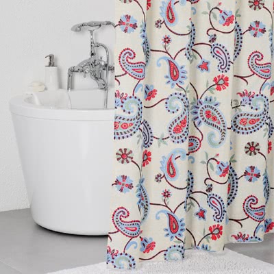 Занавеска из 100% полиэстера для ванны с 12 металлическими люверсами под кольца. Штора обработана специальной пропиткой, отталкивающей воду.