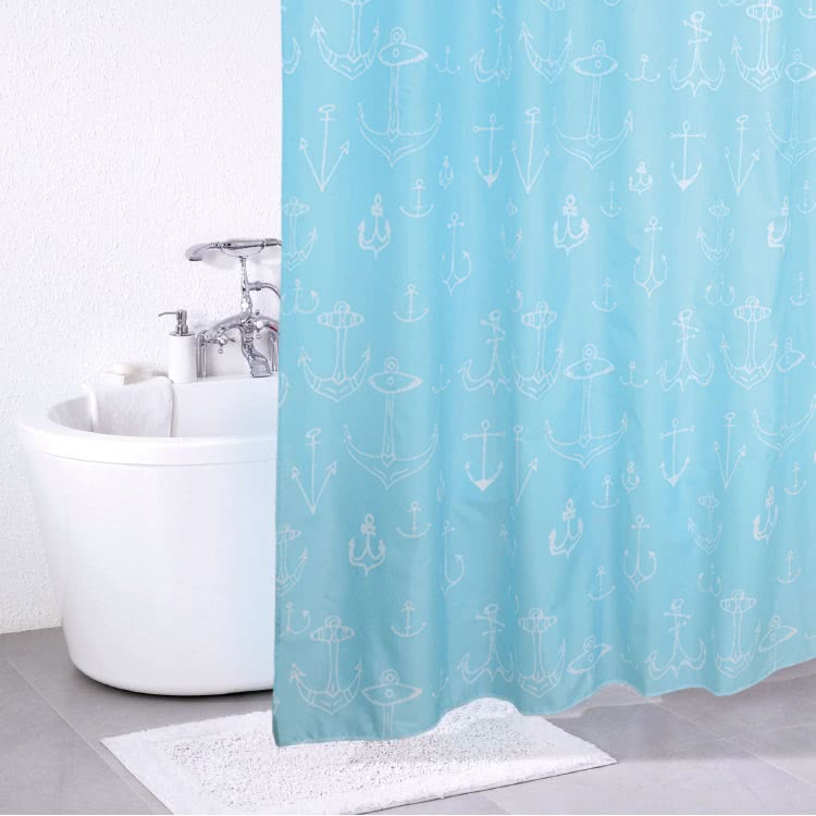 Занавеска для ванны с 12 вшитыми люверсами, надевается непосредственно на карниз (так же может использоваться с кольцами для удобства эксплуатации). Цвет: голубой. Штора обработана специальной пропиткой, отталкивающей воду.
