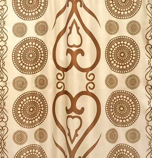 Занавеска из 100% полиэстера для ванны с 12 металлическими люверсами под кольца. Цвет: бежевый с коричневым орнаментом. Штора обработана специальной пропиткой, отталкивающей воду. Внизу по всей длине вшит шнур-утяжелитель.