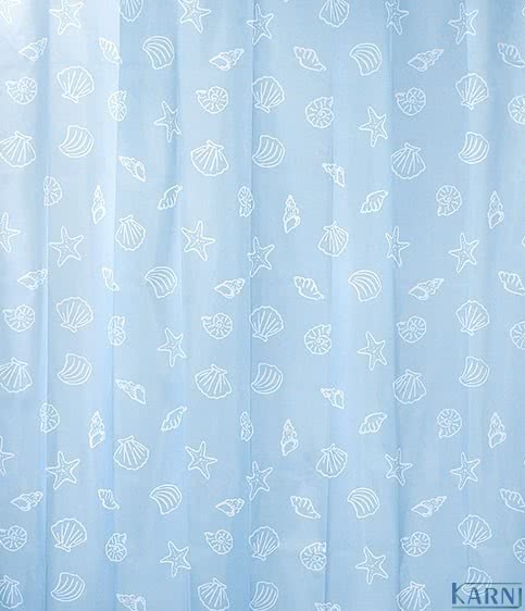 Занавеска для ванны с 12 металлическими люверсами под кольца. Штора обработана специальной пропиткой, отталкивающей воду. Внизу по всей длине вшит шнур-утяжелитель.