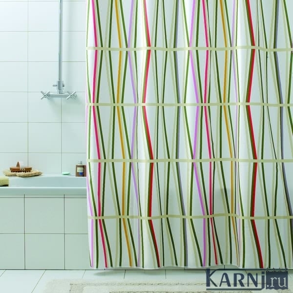 Занавеска из 100% полиэстера для ванны с 12 металлическими люверсами под кольца. Материал шторы обработан гидрофобной пропиткой, отталкивающей воду. Внизу по всей длине вшит шнур-утяжелитель.