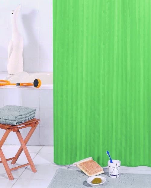 Занавеска из 100% полиэстера для ванны с 16 люверсами под кольца. Цвет: зеленый в полоску. Штора обработана специальной пропиткой, отталкивающей воду. Внизу по всей длине вшит шнур-утяжелитель.