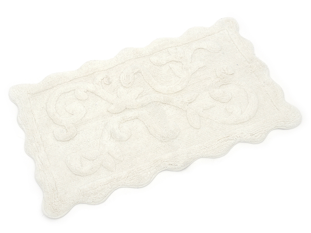 Текстильный коврик для ванной комнаты бежевого цвета. Длина ворса 1.5 см. Нижняя часть с латексным напылением, препятствующим скольжению коврика по полу.